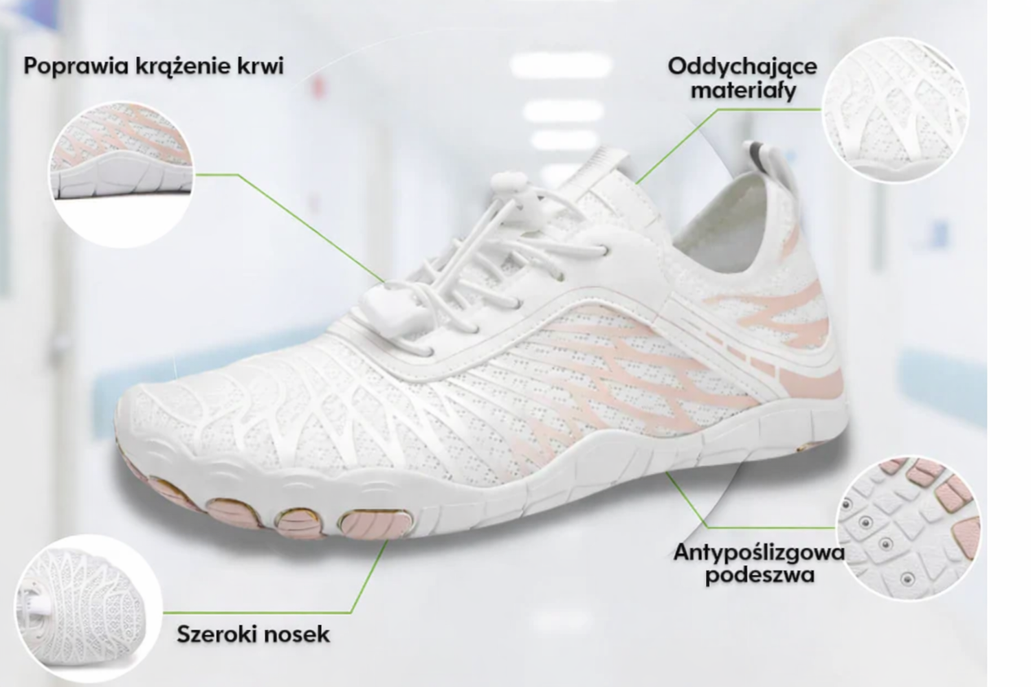 Oddychający materiał: pozwala stopom oddychać i odciąża stawy. Jest to kluczowe dla zmniejszenia podrażnień i dolegliwości związanych z takimi schorzeniami jak neuropatia czy artretyzm.